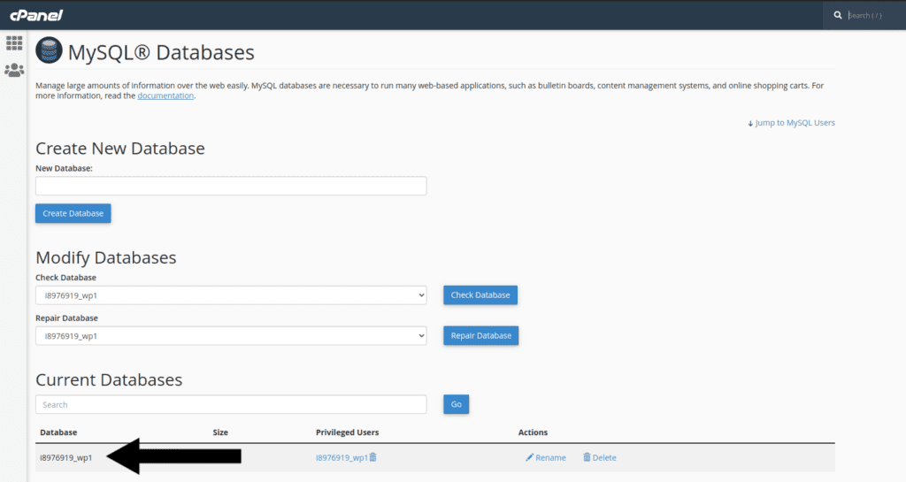 It is more common for a WordPress database to be hosted on the same server where the files exist. There are some sceanrios where a WordPress database is hosted on a separate server, but this is usually applicable for larger sites. During a standard installation process, when WordPress is being created on a server, the database is generated on the same server the files live on. It is easy to verify if the database exists on many hosting plans, as you can navigate to the server’s database section and check to make sure your database is there. Let’s take cPanel for example: