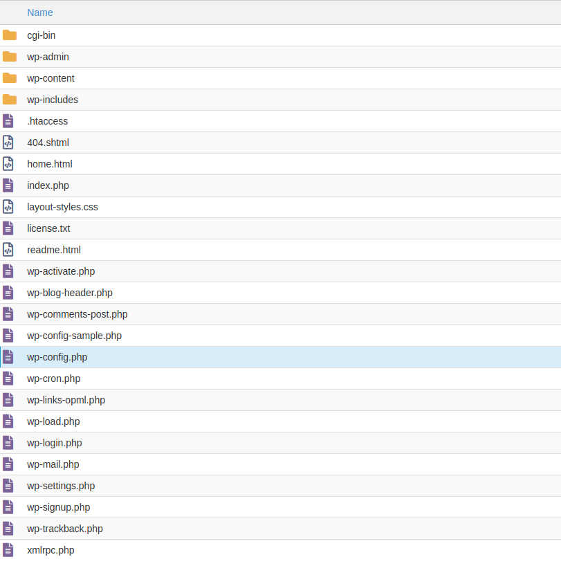 The WordPress file structure uses a crucial file called wp-config.php to connect to the database. Without this file, the site will not load. This file is found in the webroot installation like so: